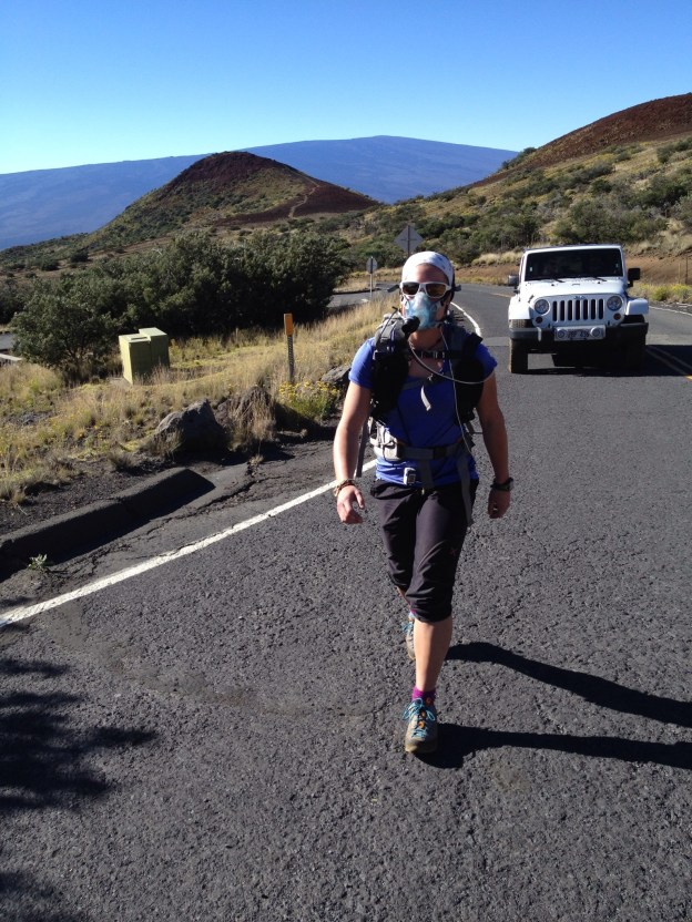 On day 4 of our study group-master course excursion we started with the field study leg of our hypobaric-normobaric comparison study at Mauna Kea. The primary outcome parameter of our comparison between the hike to Mauna Kea summit in the field and simulated at the Hermann Buhl institute in Bad Aibling is the shape of the flow volume curve and the single breath to breath comparison in the ergospirometry. On the picture you see one of the subjects with the oxycon mobile at the start point of the hike near the Mauna Kea visitor center at 2800m altitude. The ergospirometry has been repeated in each of the six subjects at the summit at 4169m altitude after the standardised hike in six hours plus one hour breaks.